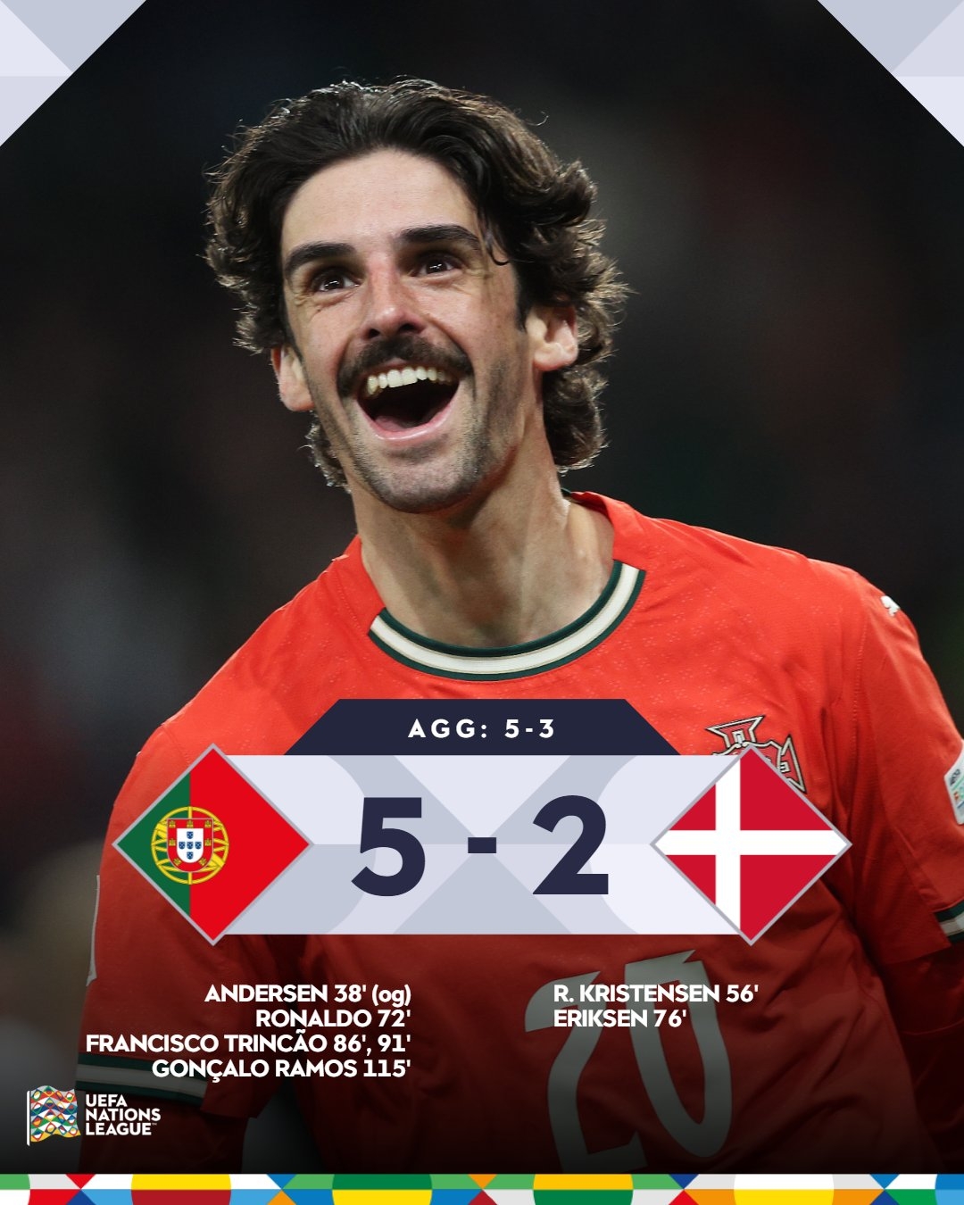 歐國(guó)聯(lián)八強(qiáng)戰(zhàn)次回合,葡萄牙5-2,總比分5-3戰(zhàn)勝丹麥,C羅失點(diǎn)+破門(mén)。