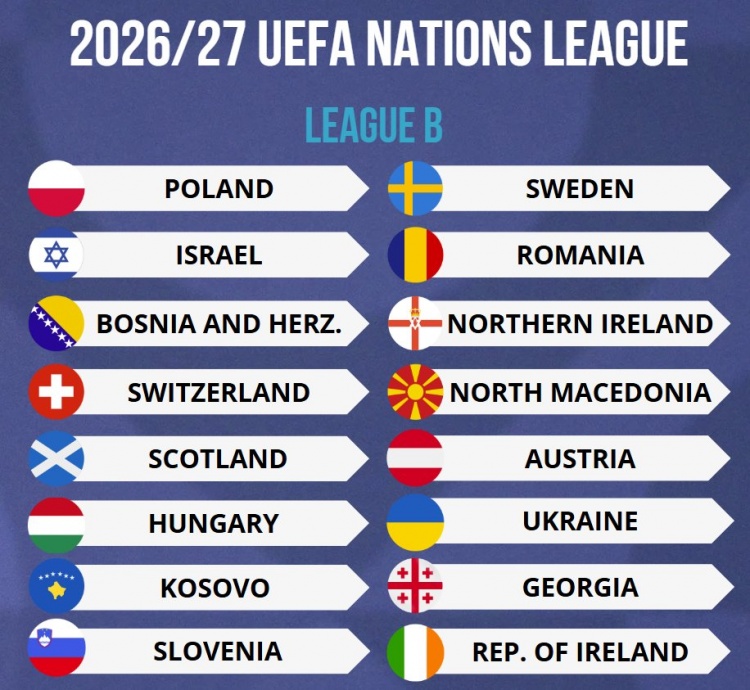 歐國(guó)聯(lián)2026-27賽季B級(jí)別球隊(duì)出爐:蘇格蘭、烏克蘭、波蘭在列