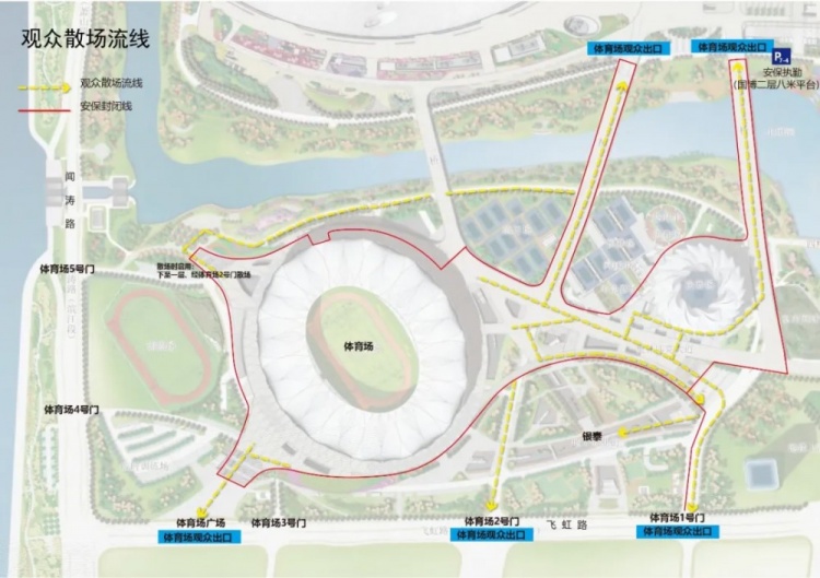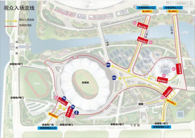 抵達(dá)現(xiàn)場的觀眾,可經(jīng)由 1 號門、西廣場、2 號橋以及 3 號橋前往體育場入口,有序入場。建議龍之隊(duì)、長城、中國制躁等有組織的球迷通過3號橋?qū)S猛ǖ赖竭_(dá)安檢口。