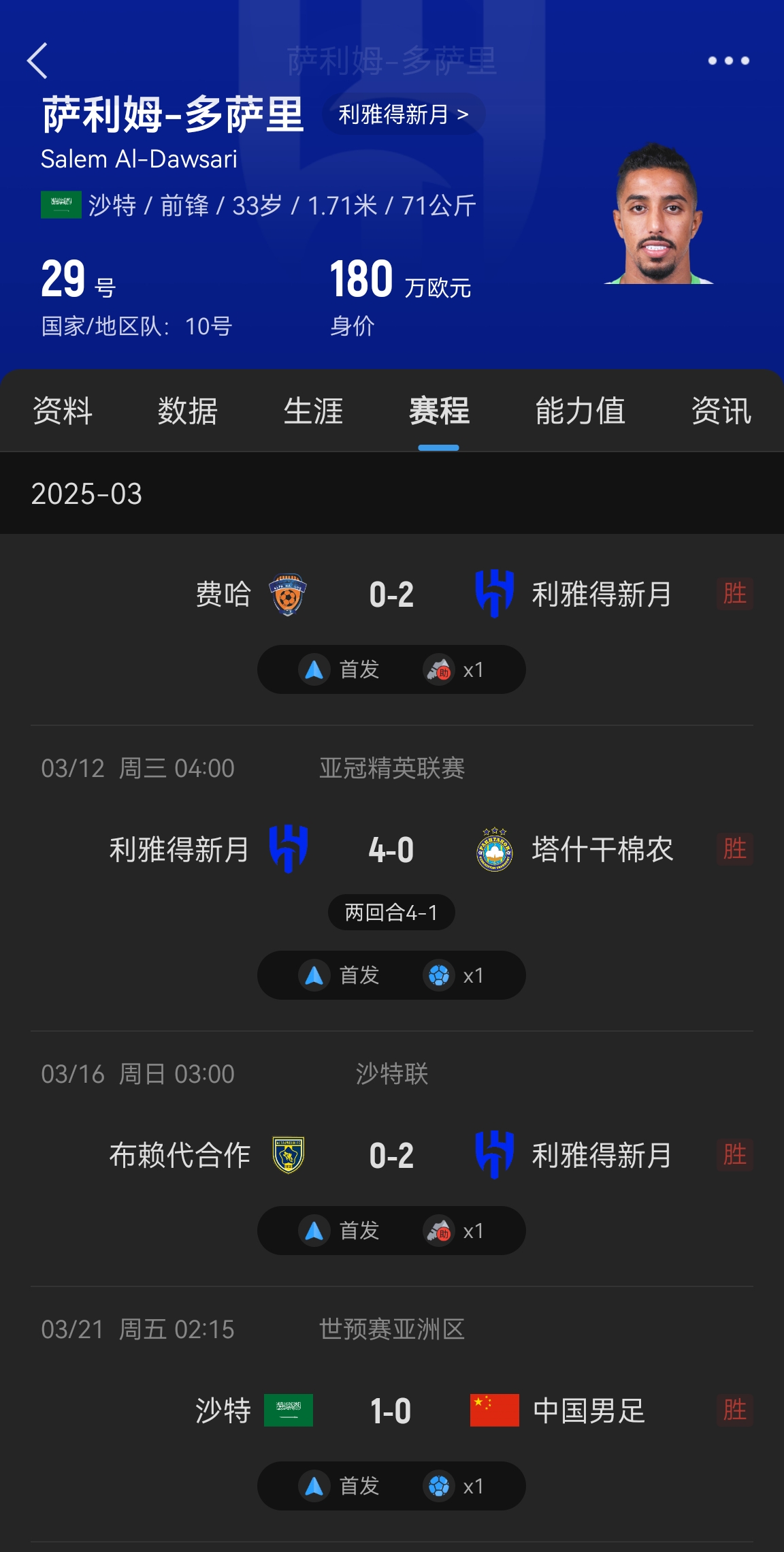 沙特隊(duì)長多薩里3月16日在沙特聯(lián)打滿全場,3月21日對國足打入制勝球