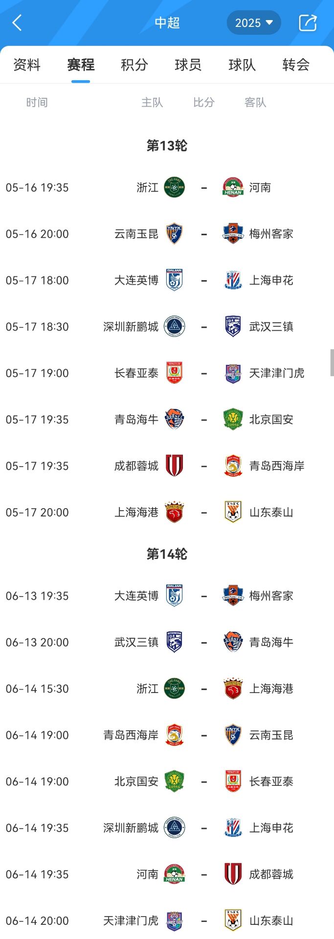 中超第13輪和第14輪間隔近一個月