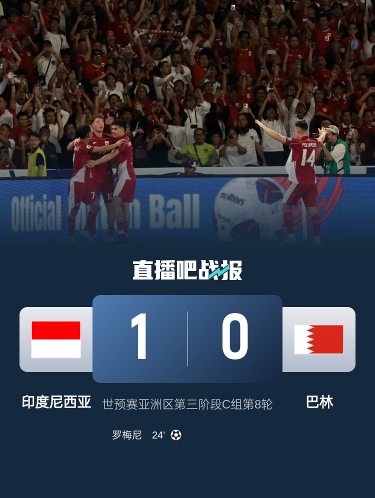 3月26日訊 18強(qiáng)賽C組第8輪,印尼隊(duì)主場(chǎng)1-0擊敗巴林隊(duì),以9個(gè)積分暫居C組第4,繼續(xù)追趕身前的沙特和澳大利亞。