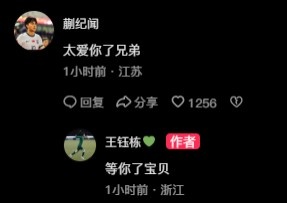 他在U20國足的隊(duì)友蒯紀(jì)聞留言“太愛你了兄弟”,王鈺棟則調(diào)侃回復(fù)“(國家隊(duì))等你了寶貝”。