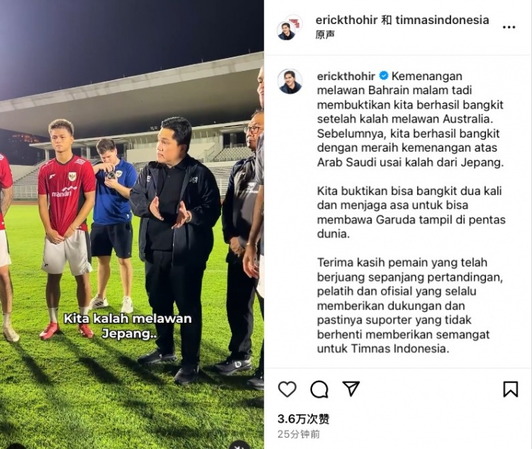 印尼足協(xié)主席托希爾在發(fā)社媒,這次他曬出了賽后他召集球員進行訓話的Vlog,視頻中托希爾說道:“此前我們在0-4慘敗日本隊后,回到主場我們2-0擊敗沙特隊;今天的情況類似,上輪我們慘敗后今天我們又擊敗了巴林隊。我希望你們接下來能繼續(xù)全力以赴。另外,我相信我們還在計劃當中:我們依舊保留通往世界杯的希望?!?/p>