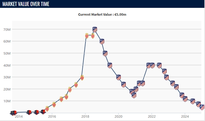 但在高價(jià)加盟馬競(jìng)之后,勒馬爾的效率直線下滑,他也頻繁受到傷病困擾,身價(jià)一路走低,從巔峰時(shí)期的7000萬歐,掉到現(xiàn)在的500萬。
