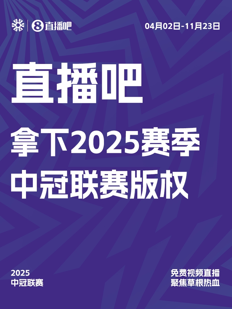 告訴吧友們一個(gè)好消息,我們拿到了2025賽季中國(guó)足協(xié)杯版權(quán)、2025賽季中國(guó)足球甲級(jí)聯(lián)賽版權(quán)、2025賽季中國(guó)足球乙級(jí)聯(lián)賽版權(quán)、2025賽季中冠聯(lián)賽版權(quán)。2025賽季,將全程免費(fèi)視頻直播足協(xié)杯、中甲、中乙、中冠四項(xiàng)賽事。上,高清比賽免費(fèi)看,與億萬吧友同頻共振!