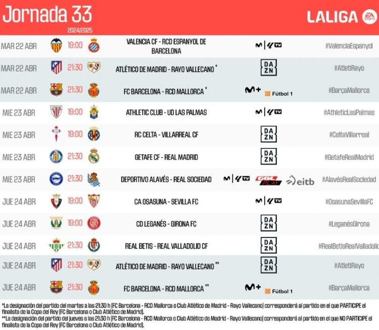 3月27日訊 西甲官方公布第33輪比賽時(shí)間,皇馬4月24日3:30出戰(zhàn)赫塔費(fèi),巴薩和馬競(jìng)的比賽時(shí)間視國(guó)王杯半決賽結(jié)果而定。