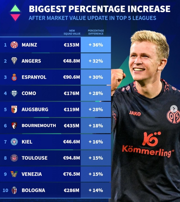 五大聯(lián)賽球隊身價升值比例:美因茨漲36%,博洛尼亞&伯恩茅斯在列