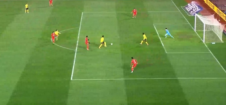 第6分鐘,西海岸前場左路搶斷后傳中,何龍海后點鏟射打偏,此球也越位了。↓