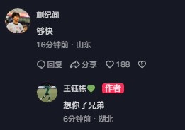 隨后他在U20國足的隊友蒯紀聞留言寫道:“夠快。”王鈺棟則回復(fù)稱:“想你了兄弟。”