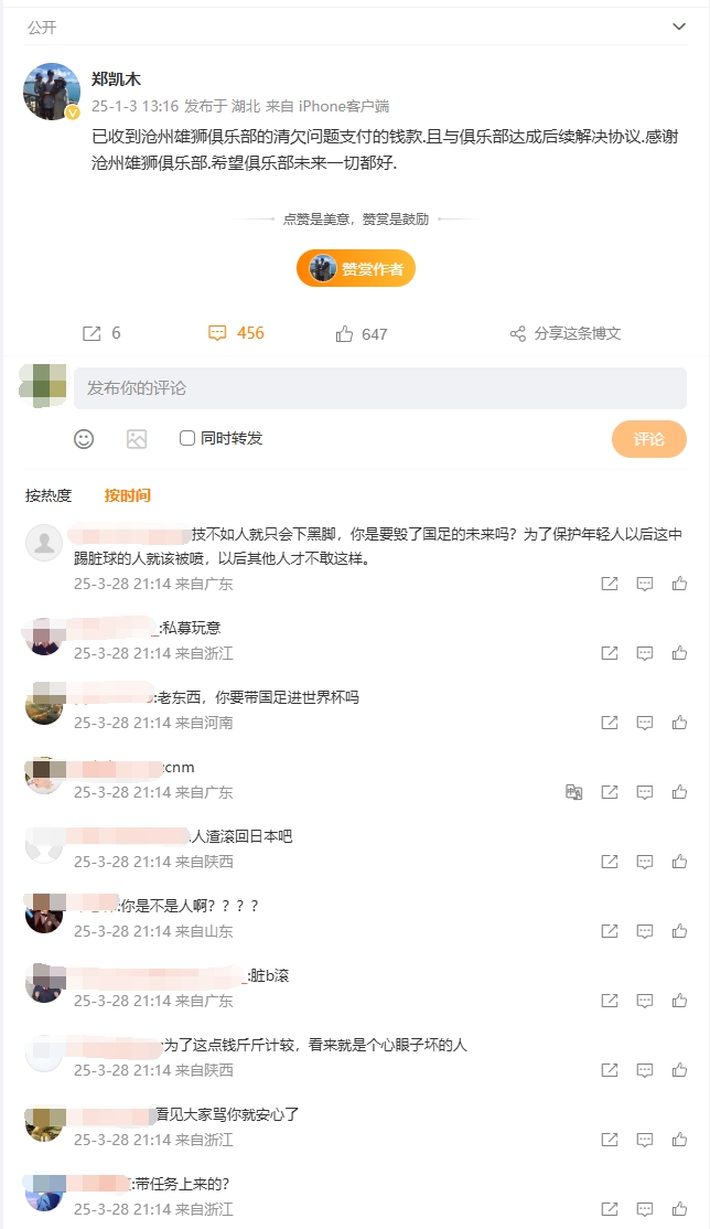 不少球迷第一時(shí)間沖入鄭凱木的個(gè)人微博進(jìn)行聲討,他最新的一條動(dòng)態(tài)在短時(shí)間內(nèi)被刷了數(shù)百條評(píng)論,大多都是在責(zé)罵鄭凱木對(duì)王鈺棟的犯規(guī)。