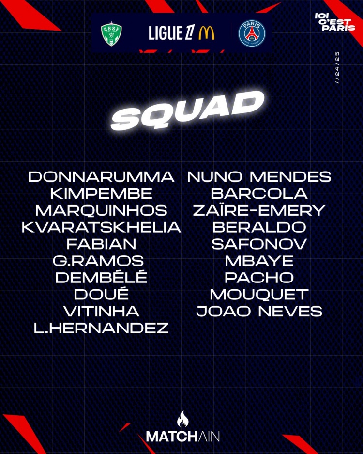 3月29日訊 北京時間明天凌晨2點,巴黎將在法甲第27輪比賽中客場對陣圣埃蒂安,巴黎公布了此役的球員名單,登貝萊、杜埃、克瓦拉茨赫利亞在列,阿什拉夫、李剛?cè)?、馬尤盧缺席。