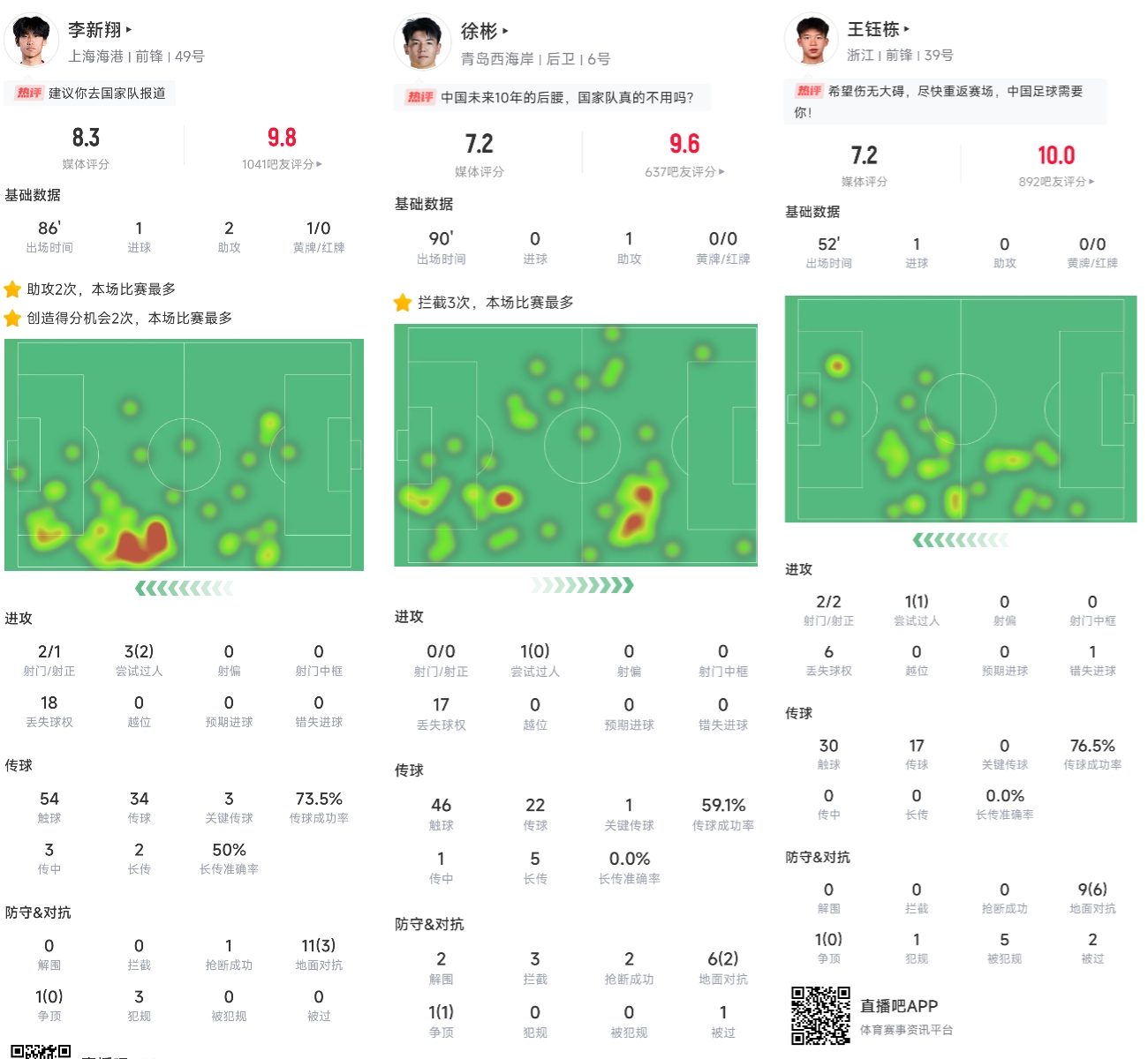 上海海港客場3-3戰(zhàn)平青島西海岸,19歲的海港小將李新翔首發(fā)迎來中超首秀,全場比賽1射2傳發(fā)揮亮眼,幫助海港搶下一分;青島西海岸20歲的后腰徐彬也表現(xiàn)出色,為阿齊茲送出一次助攻。