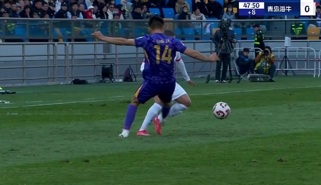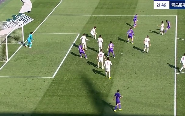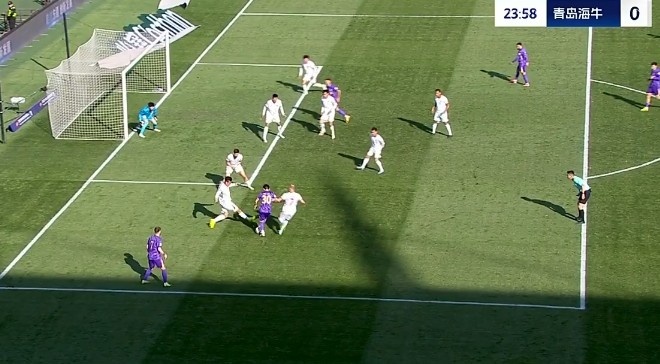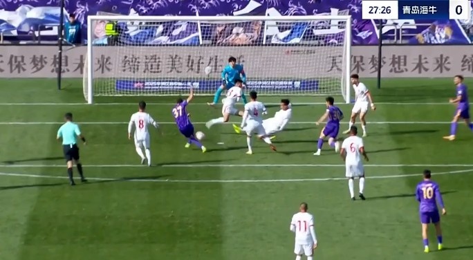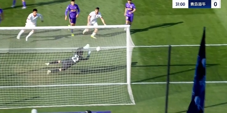 第31分鐘,青島海牛禁區(qū)里一次頭球攻門(mén)被門(mén)將飛身?yè)涑龅拙€?!?/p>