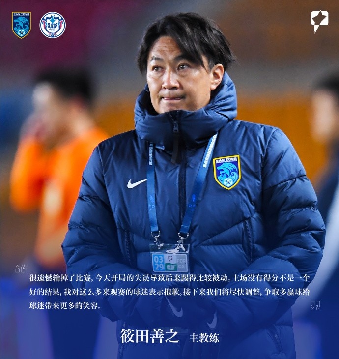 筱田善之談到本場比賽時(shí)說道:“很遺憾輸?shù)袅吮荣?,今天開局的失誤導(dǎo)致后來踢得比較被動(dòng)?!?/p>