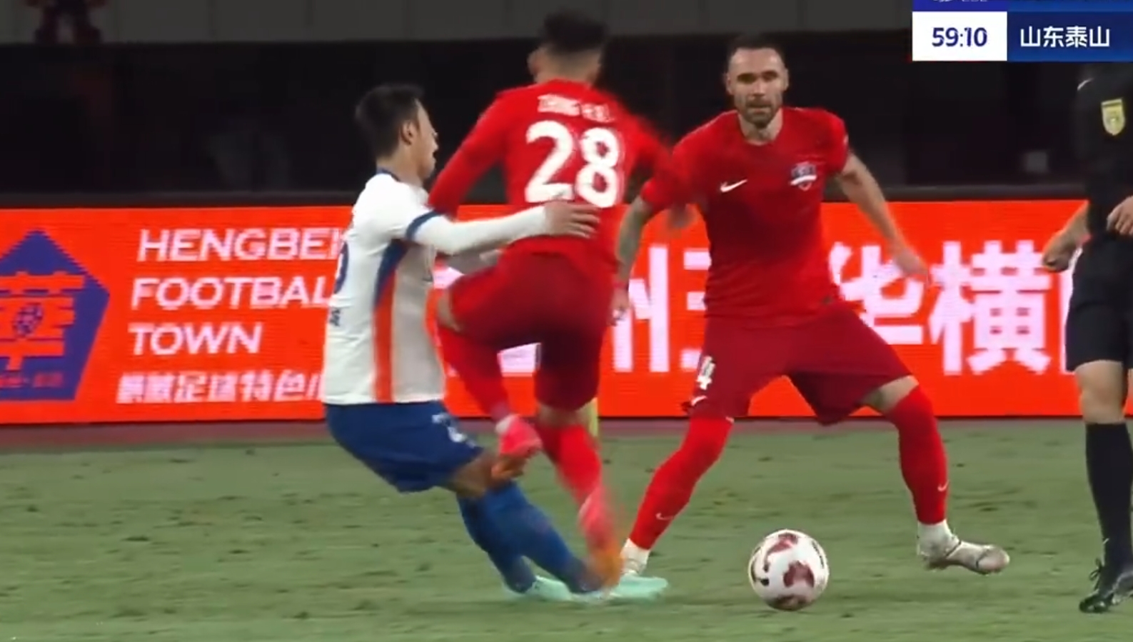 梅州客家3-4山東泰山 鐘浩然跳起搶斷,鞋底踩彭欣力膝蓋直紅下場(chǎng)↓