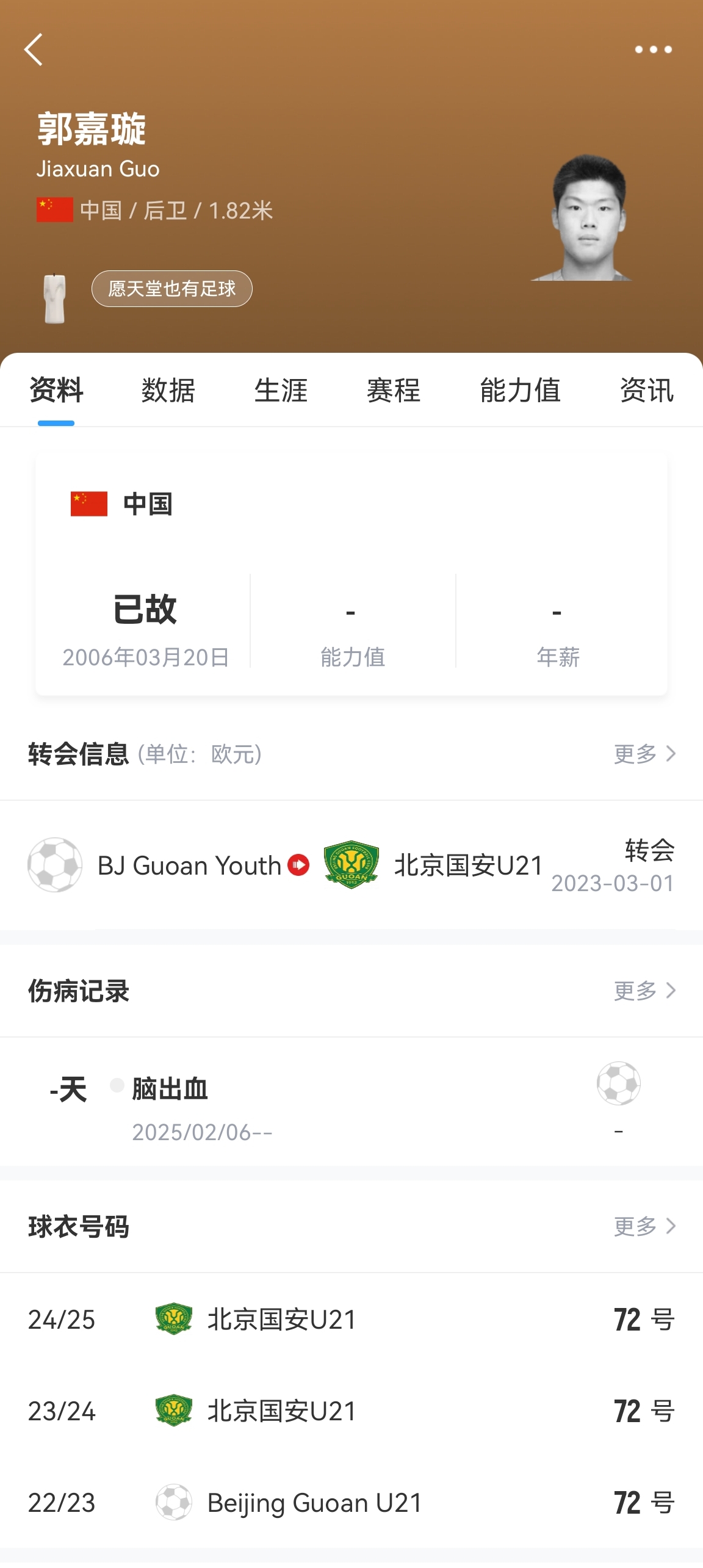 3月19日,國安小將郭嘉璇在天壇醫(yī)院去世,年僅18歲,當(dāng)時距離他19歲的生日只有1個小時。