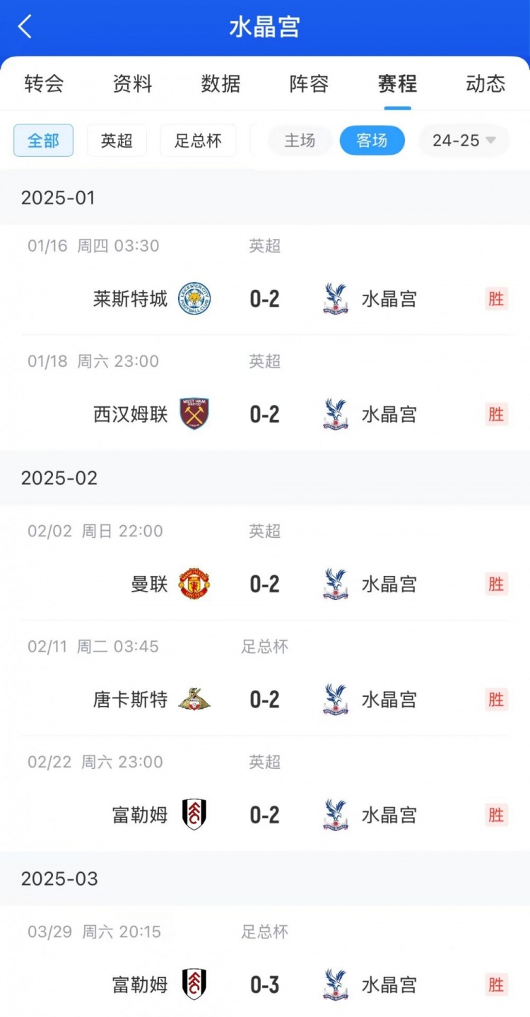 各項(xiàng)賽事客場(chǎng)6連勝+0丟球,水晶宮是英格蘭頂級(jí)聯(lián)賽歷史首隊(duì)