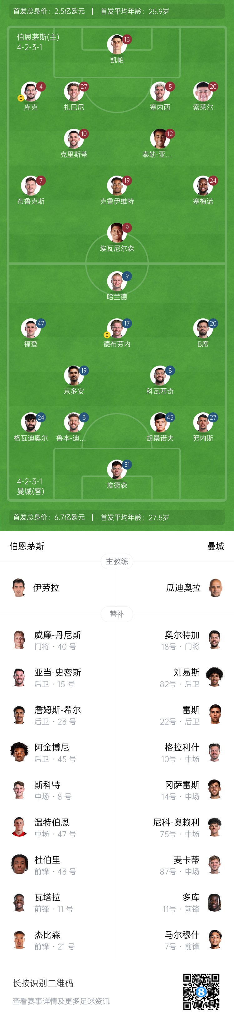 曼城首發(fā):31-埃德森、27-努內(nèi)斯、45-胡桑諾夫、3-魯本-迪亞斯、24-格瓦迪奧爾、19-京多安、8-科瓦西奇、17-德布勞內(nèi)、20-B席、47-福登、9-哈蘭德