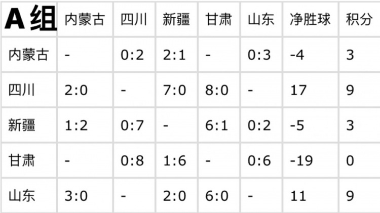 目前,四川和山東同積9分,憑借出色的表現(xiàn)已提前鎖定出線資格。在凈勝球方面,四川以17個凈勝球領先,山東凈勝球為11個。內(nèi)蒙古和新疆均積3分,甘肅積0分已確定無緣出線。最后一輪比賽,雖無直接影響出線的關鍵對決,但各隊仍會為榮譽而戰(zhàn),力求以更好的成績結束資格賽階段。