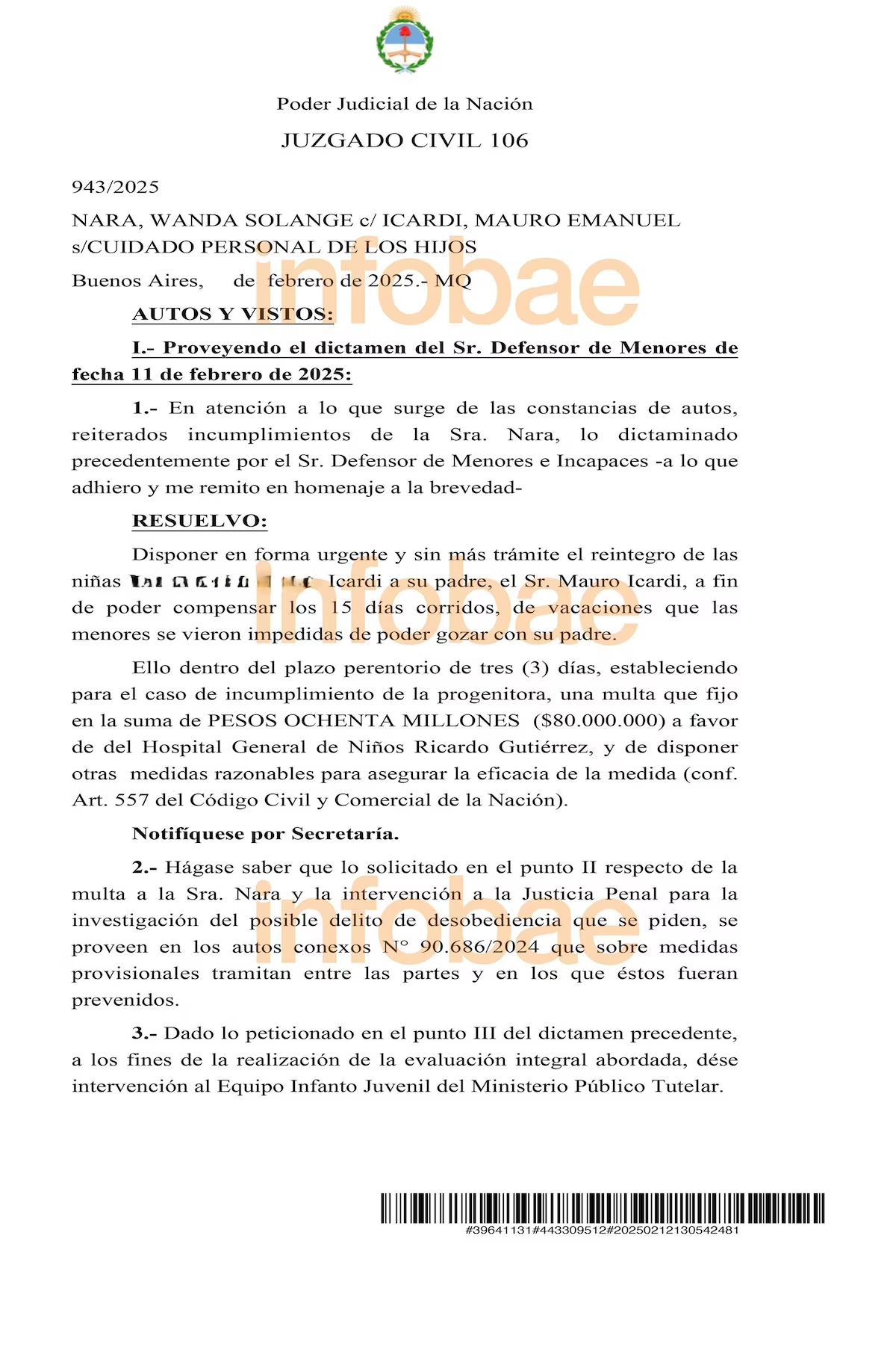 阿媒Infobae報道,法院做出了有利于伊卡爾迪的裁決,旺達(dá)需要在三天內(nèi)歸還兩個女兒,否則將面臨罰款。