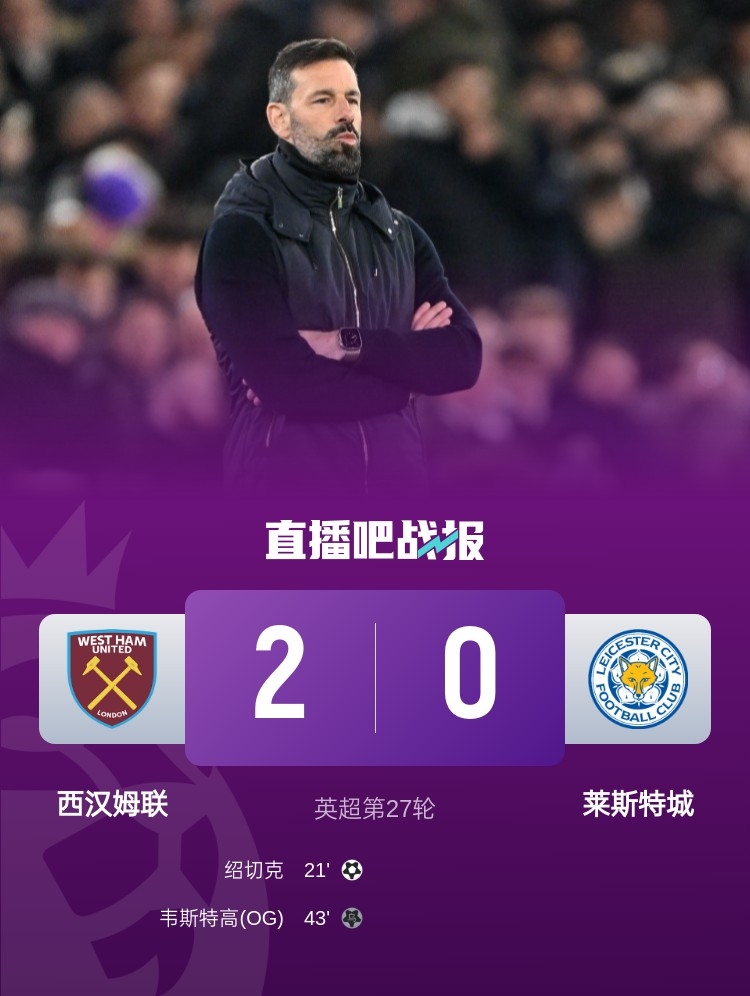 英超第27輪,萊斯特城客場(chǎng)0-2不敵西漢姆,遭遇各賽事5連敗。