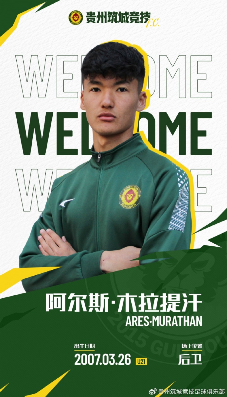 ??經(jīng)與球員協(xié)商一致,阿爾斯-木拉提汗正式加盟貴州筑城競(jìng)技足球俱樂部。阿爾斯-木拉提汗2007年3月26日出生于新疆烏魯木齊,身高192cm,體重80kg,司職中后衛(wèi)。