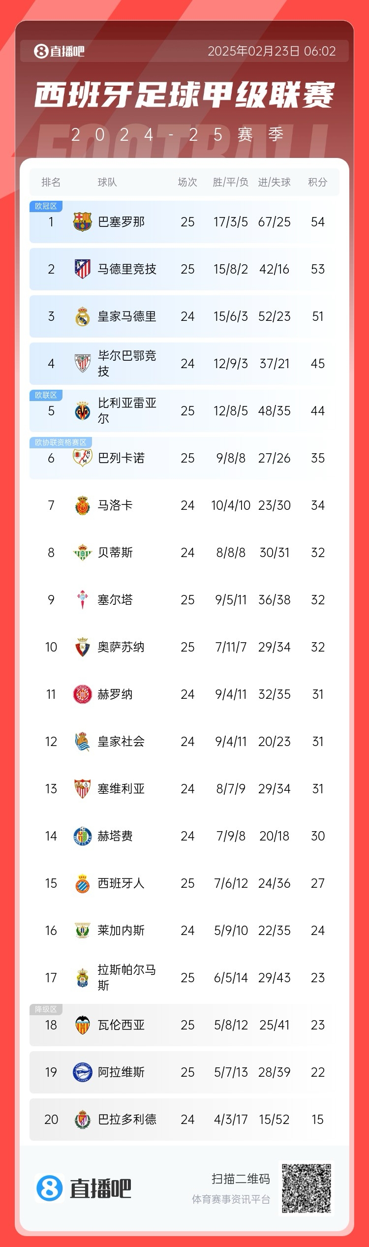 保住榜首!西甲積分榜:巴薩領(lǐng)先馬競1分,領(lǐng)先未賽的皇馬3分