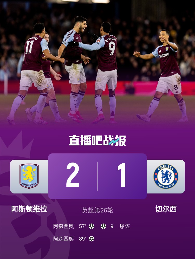 英超聯(lián)賽第26輪,切爾西客場1-2遭遇阿斯頓維拉逆轉(zhuǎn)絕殺,阿森西奧梅開二度,拉什福德2次助攻。