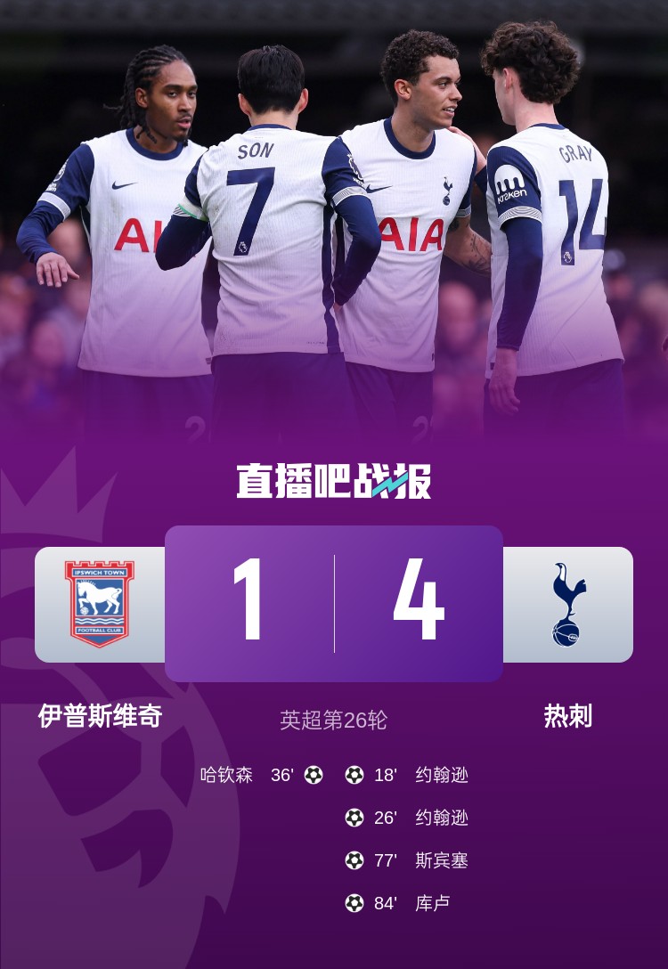 英超第26輪,熱刺客場4-1伊普斯維奇取得三連勝,約翰遜梅開二度。