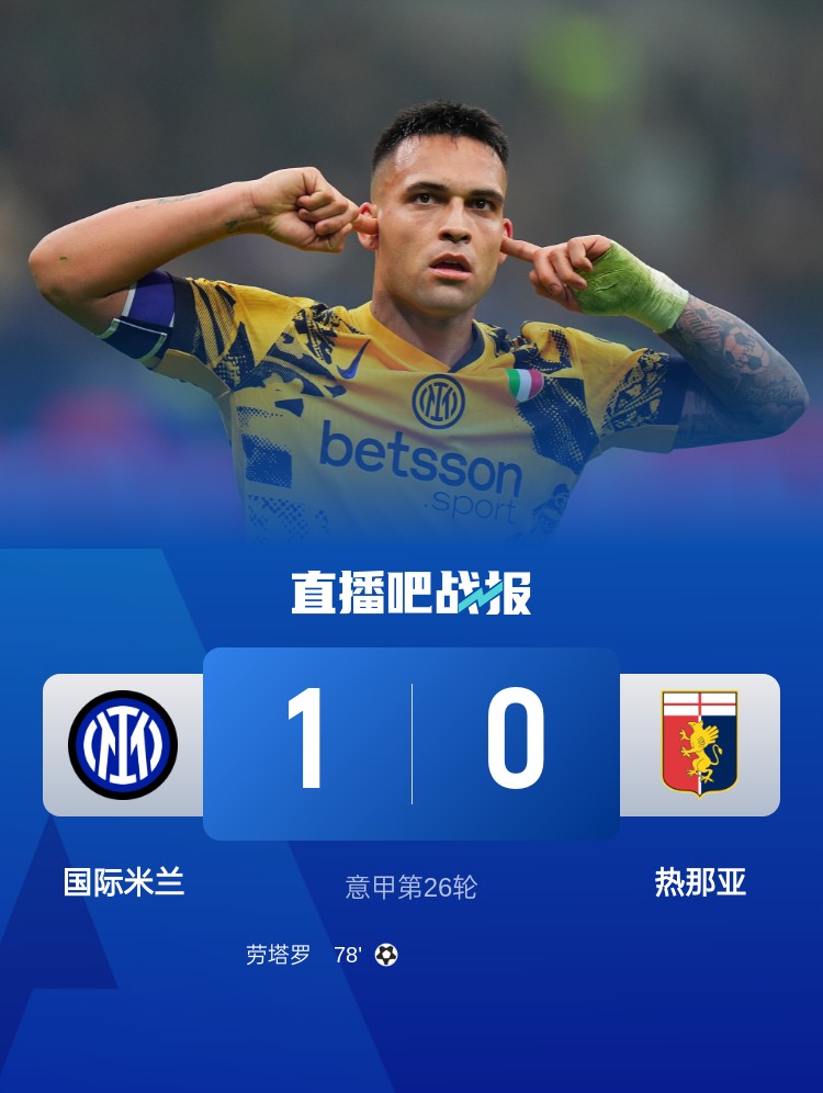意甲第26輪,國際米蘭1-0戰(zhàn)勝熱那亞,暫登頂,勞塔羅頭球制勝。
