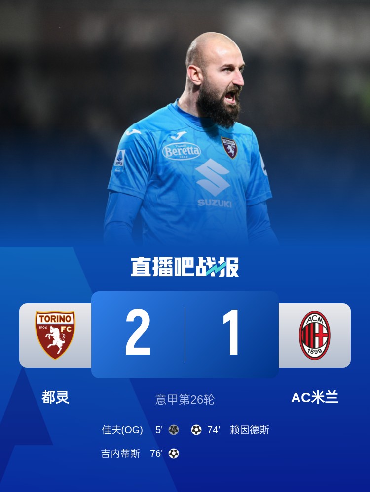 意甲第26輪,AC米蘭客場1-2不敵都靈,佳夫?yàn)觚埱?,都靈門將瓦尼亞發(fā)揮出色。