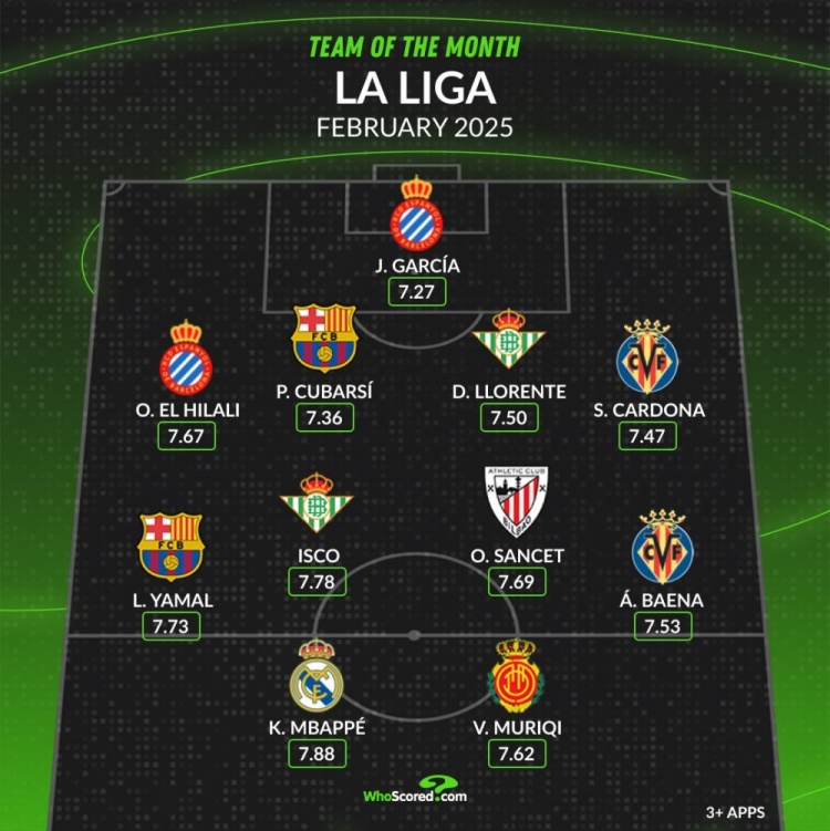 whoscored西甲2月最佳陣:姆巴佩、亞馬爾領(lǐng)銜,伊斯科在列