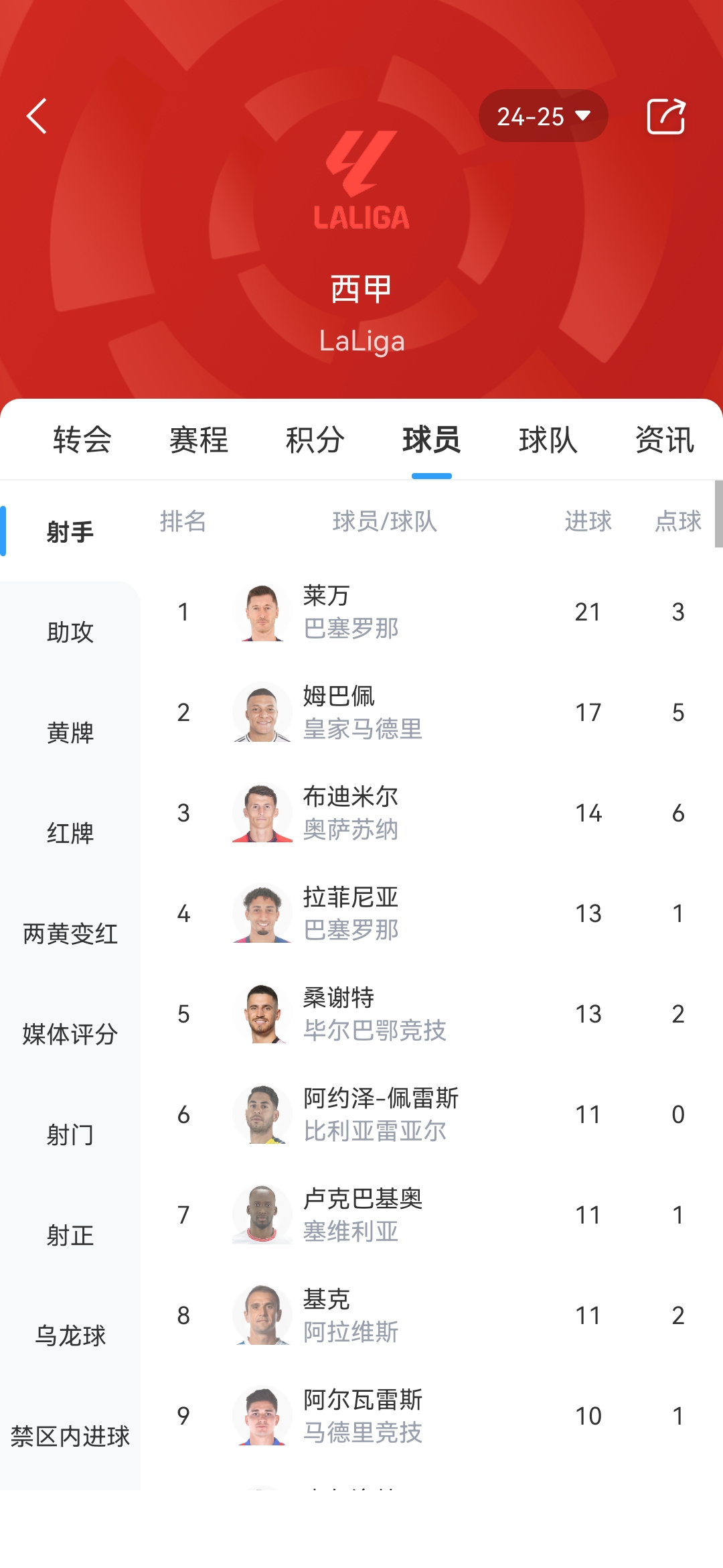 西甲射手榜: