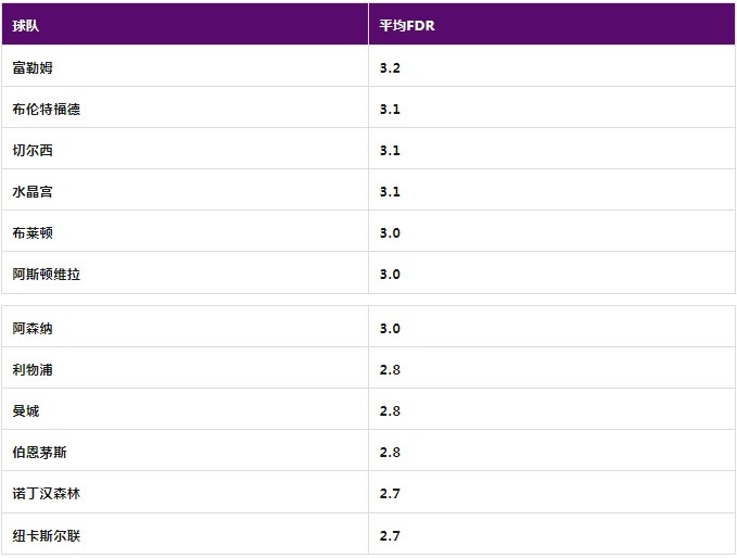 根據(jù)賽程難度評級系統(tǒng)(FDR),我們可以從紙面上看到各支球隊(duì)的賽程難度,該系統(tǒng)將每場比賽的難度從1(容易)到5(困難)進(jìn)行排序,數(shù)值越高代表比賽難度越大。
