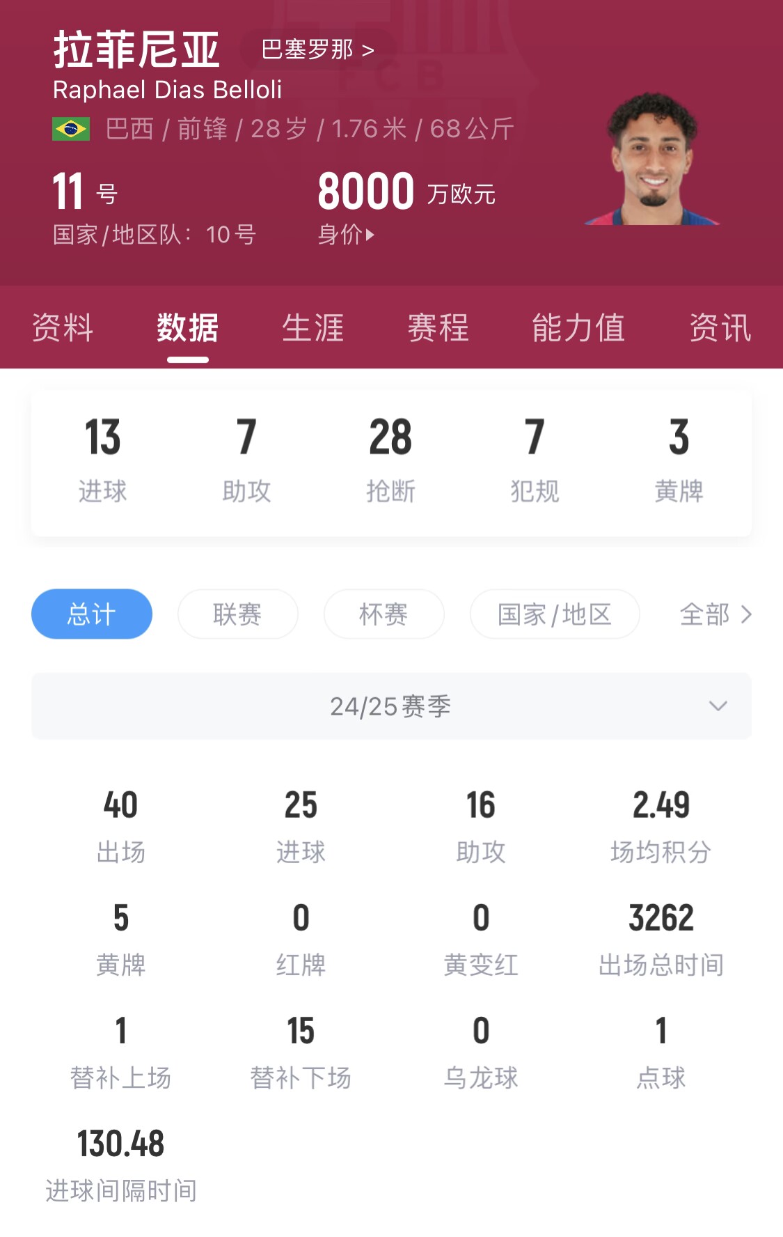 實(shí)打?qū)嵉?000萬!拉菲尼亞25球16助,金球獎賠率第3高于維尼修斯
